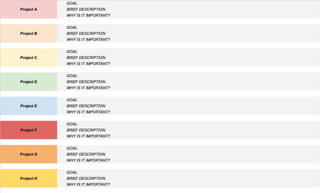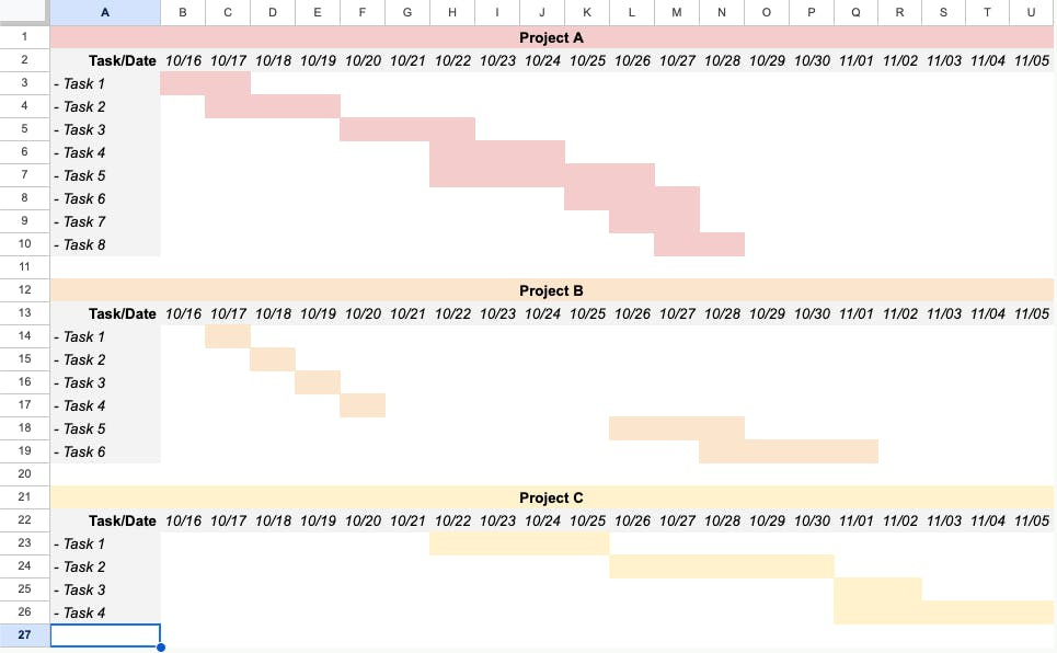 This gives me a visual representation of dates and deadlines. It also ensures I know the dependencies of each project.